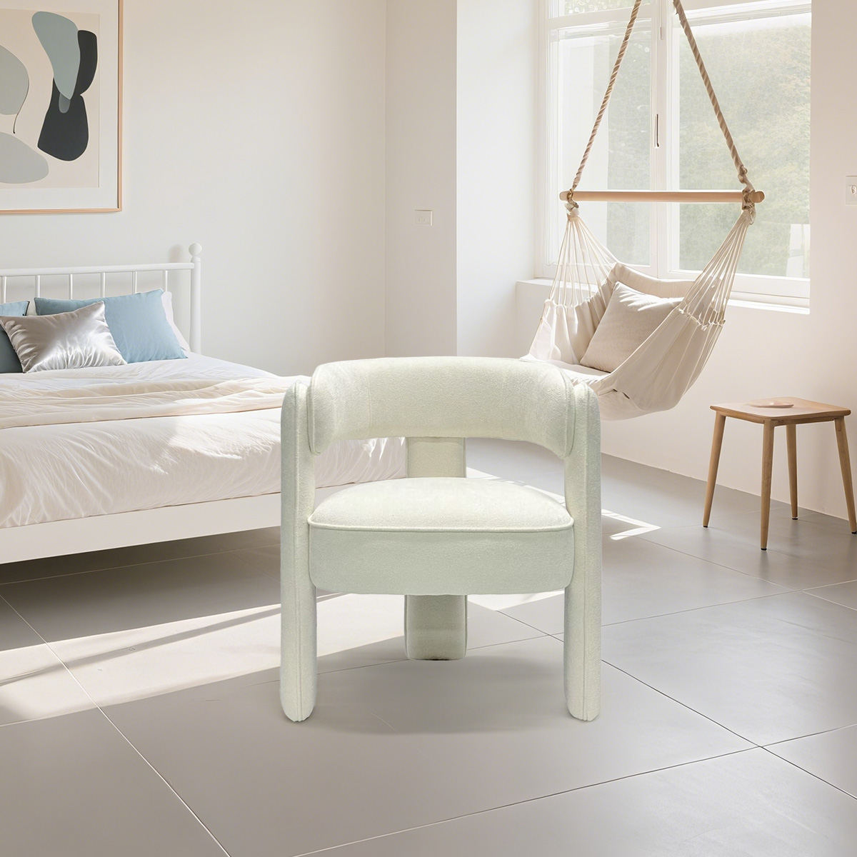 Scaun modern alb Boucle Barrel cu spătar deschis – Fotoliu tapițat pentru sufragerie și sufragerie