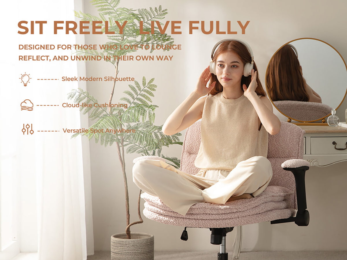 Cotierele rabatabile maximizează flexibilitatea — stați cu picioarele încrucișate, în lateral, încovoiat sau în poziție verticală cu ușurință. Acest scaun este construit pentru confort, mișcare și stil, fiind perfect potrivit pentru birouri de acasă, dormitoare și spații creative.