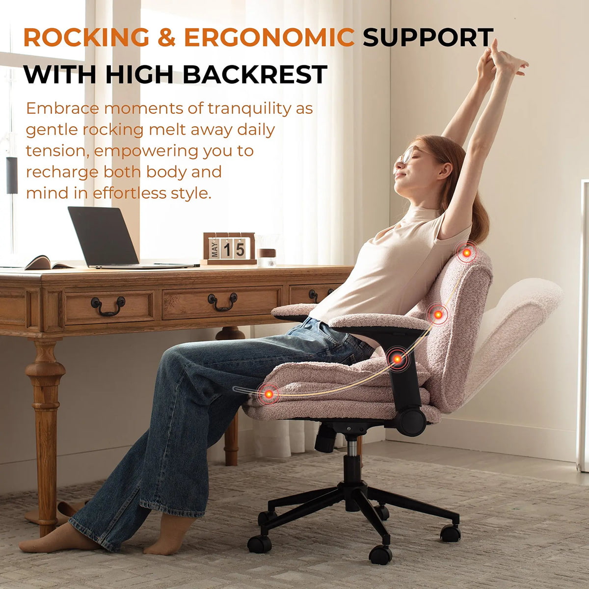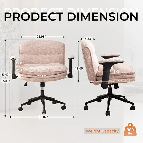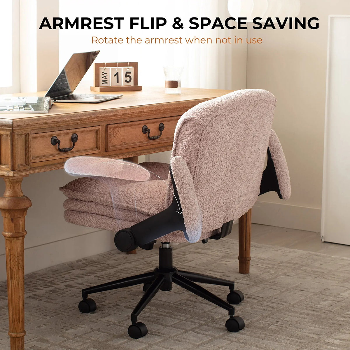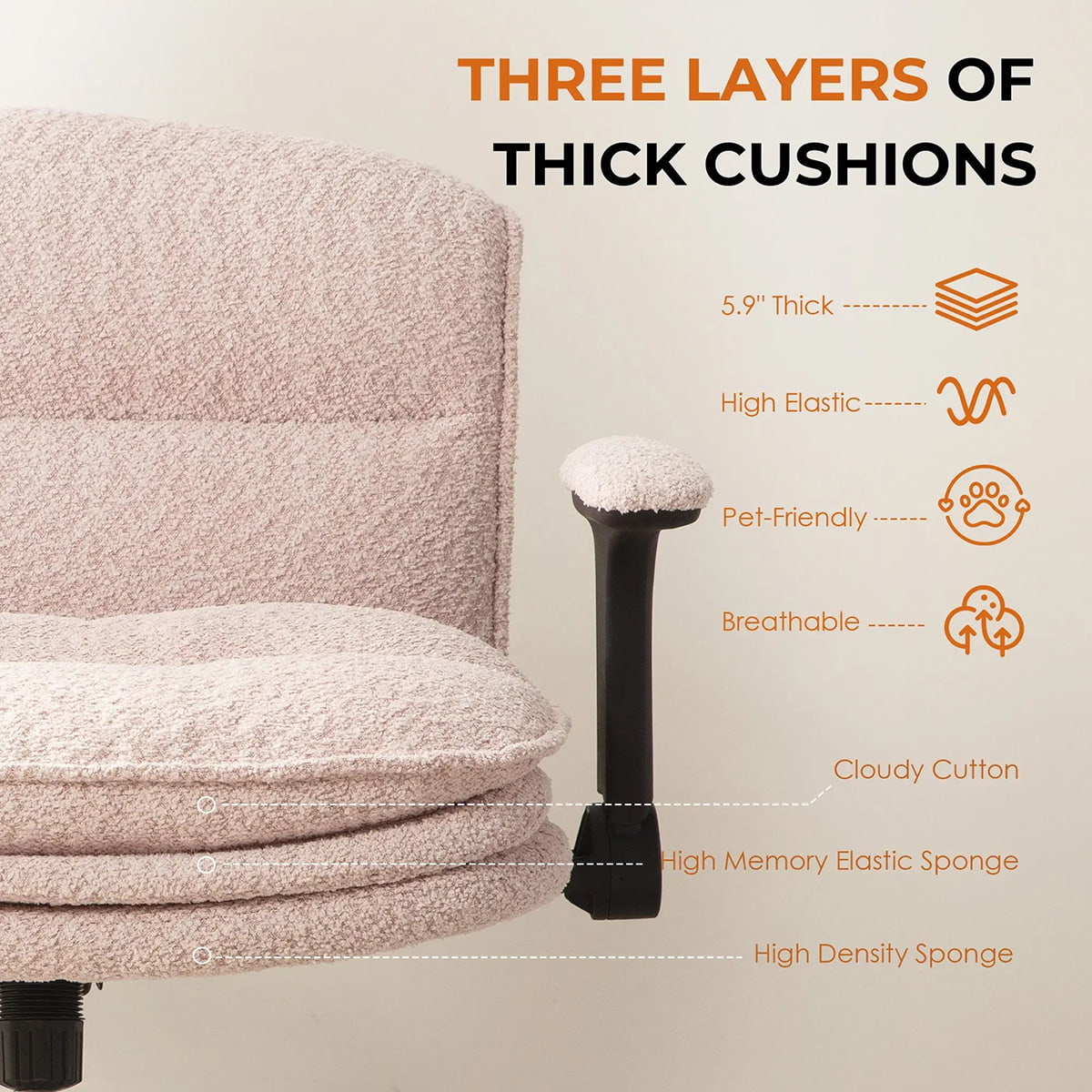 ① Scaun de birou Criss Cross cu brațe rabatabile și pernă cu 3 straturi — Scaun de birou ergonomic buclé cu scaun lat cu roți