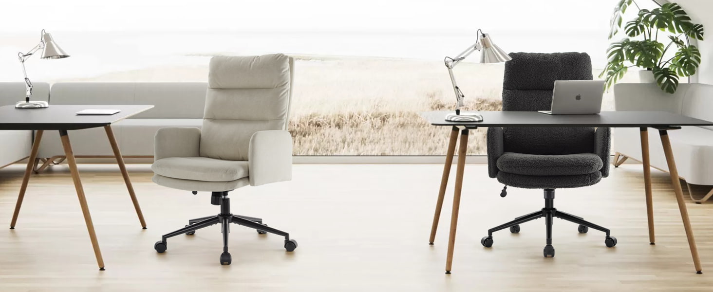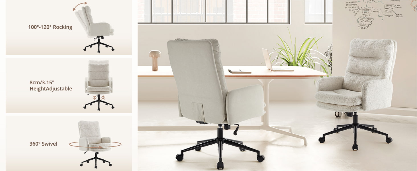 Acest scaun de birou din cașmir cu spătar înalt este conceput pentru cumpărătorii care apreciază confortul premium, estetica modernă și suportul ergonomic. Dispunând de un scaun căptușit cu două straturi, din bumbac și burete de înaltă densitate, scaunul oferă o moliciune asemănătoare unui nor, menținând în același timp un sprijin stabil în timpul sesiunilor lungi de ședere. Țesătura moale de cașmir artificial oferă o atingere caldă și prietenoasă cu pielea, făcându-l perfect pentru birouri de acasă, dormitoare, amenajări de toaletă și spații de lucru contemporane. Baza sa pivotantă la 360°, ridicarea certificată SGS, rotile silențioase și funcția de balansare 100°–120° îl fac potrivit pentru productivitate, relaxare și utilizare zilnică.