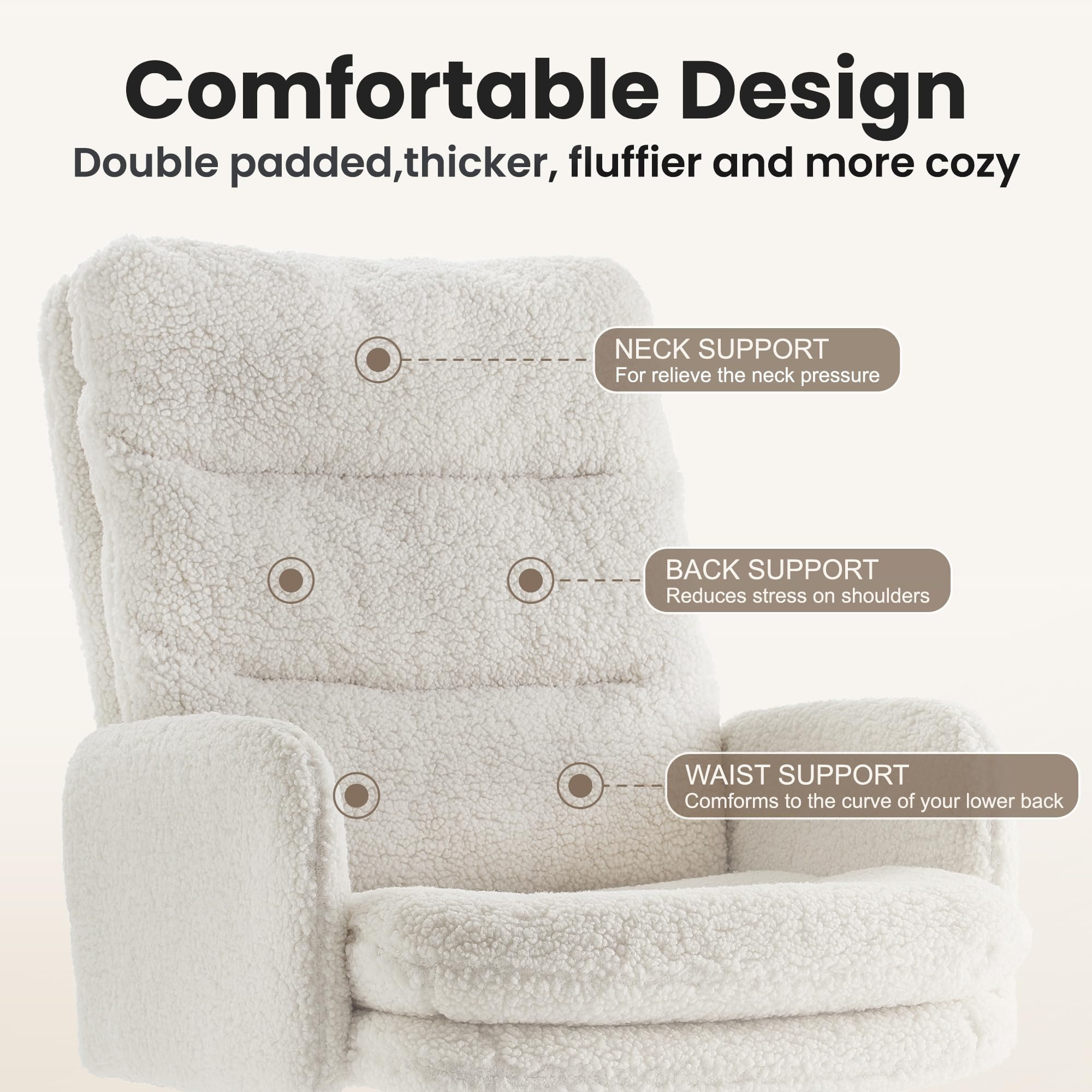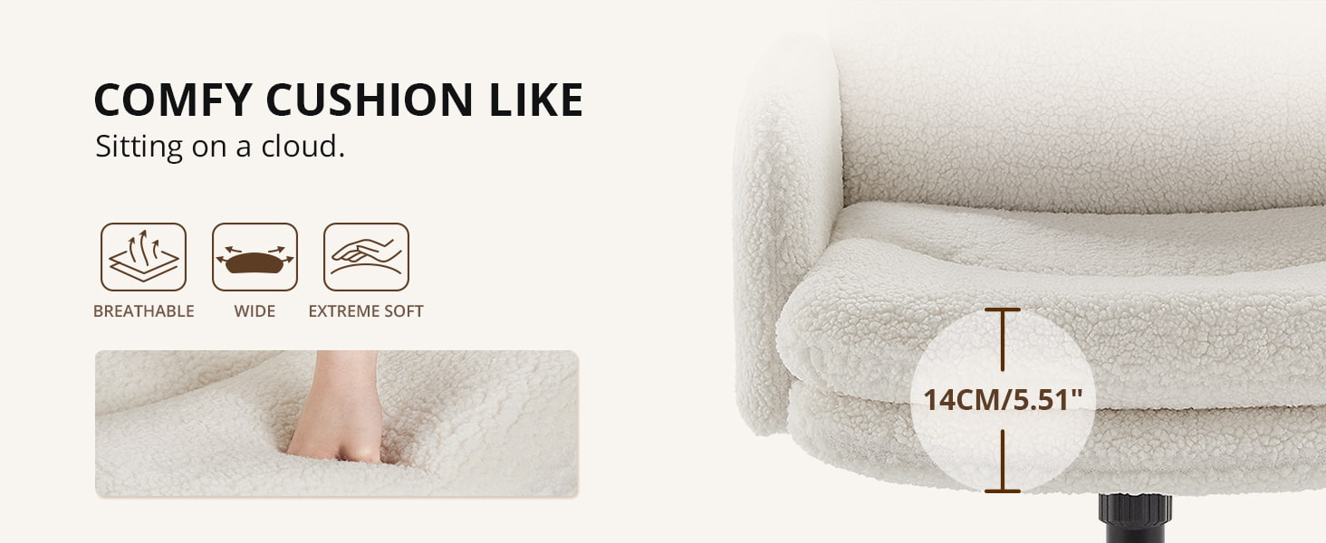 Perna cu două straturi - cu bumbac pufos și burete de înaltă densitate - oferă o experiență de șezut asemănătoare unui nor, care rămâne confortabilă chiar și în timpul sesiunilor lungi de lucru sau de studiu. Scaunul include o funcție de balansare de 100°–120°, un scaun reglabil pe înălțime de 3,15 inchi (8 cm) și pivotare la 360°, oferindu-vă flexibilitate deplină pe tot parcursul zilei.