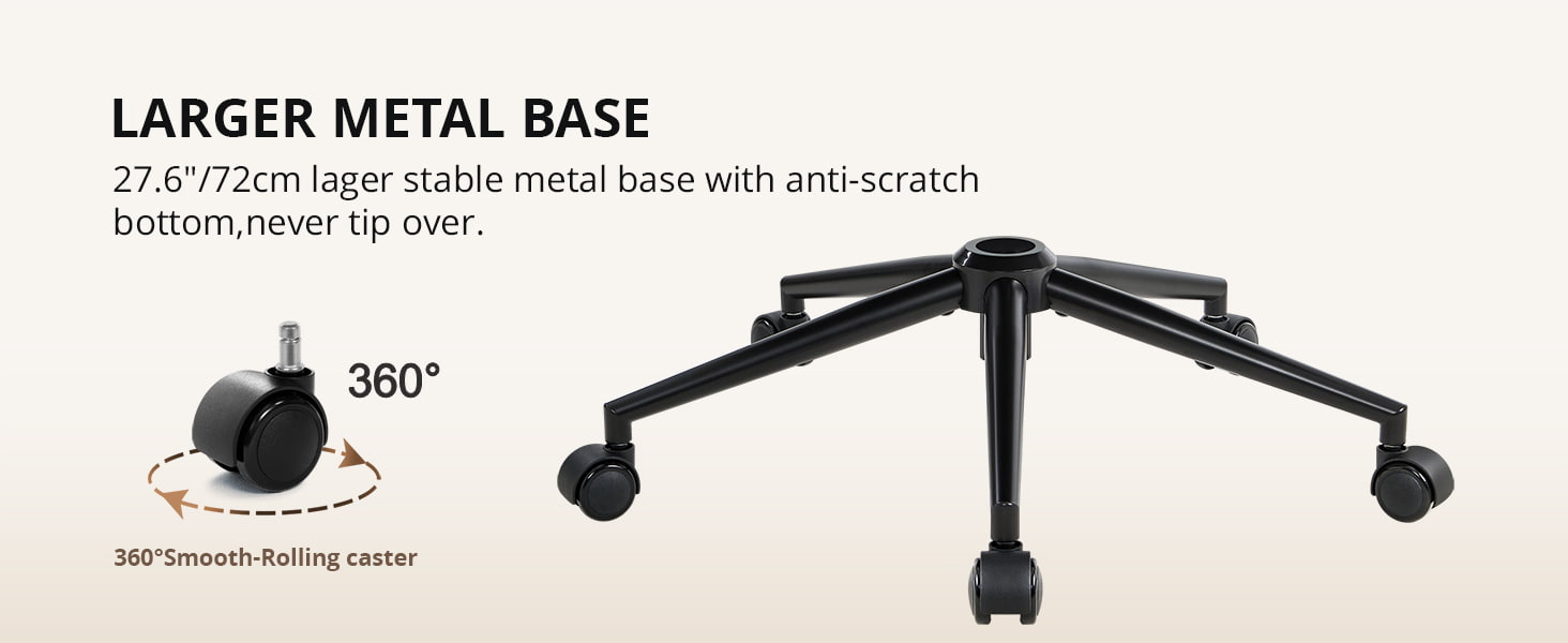 O bază metalică lată de 72 cm (28,35") asigură stabilitate, iar roțile silențioase din nailon se rotesc fără probleme, fără a vă zgâria podeaua. Perfect pentru birouri de acasă, săli de studiu, dormitoare și amenajări de toaletă, acest scaun îmbină confortul, estetica și caracterul practic de zi cu zi.