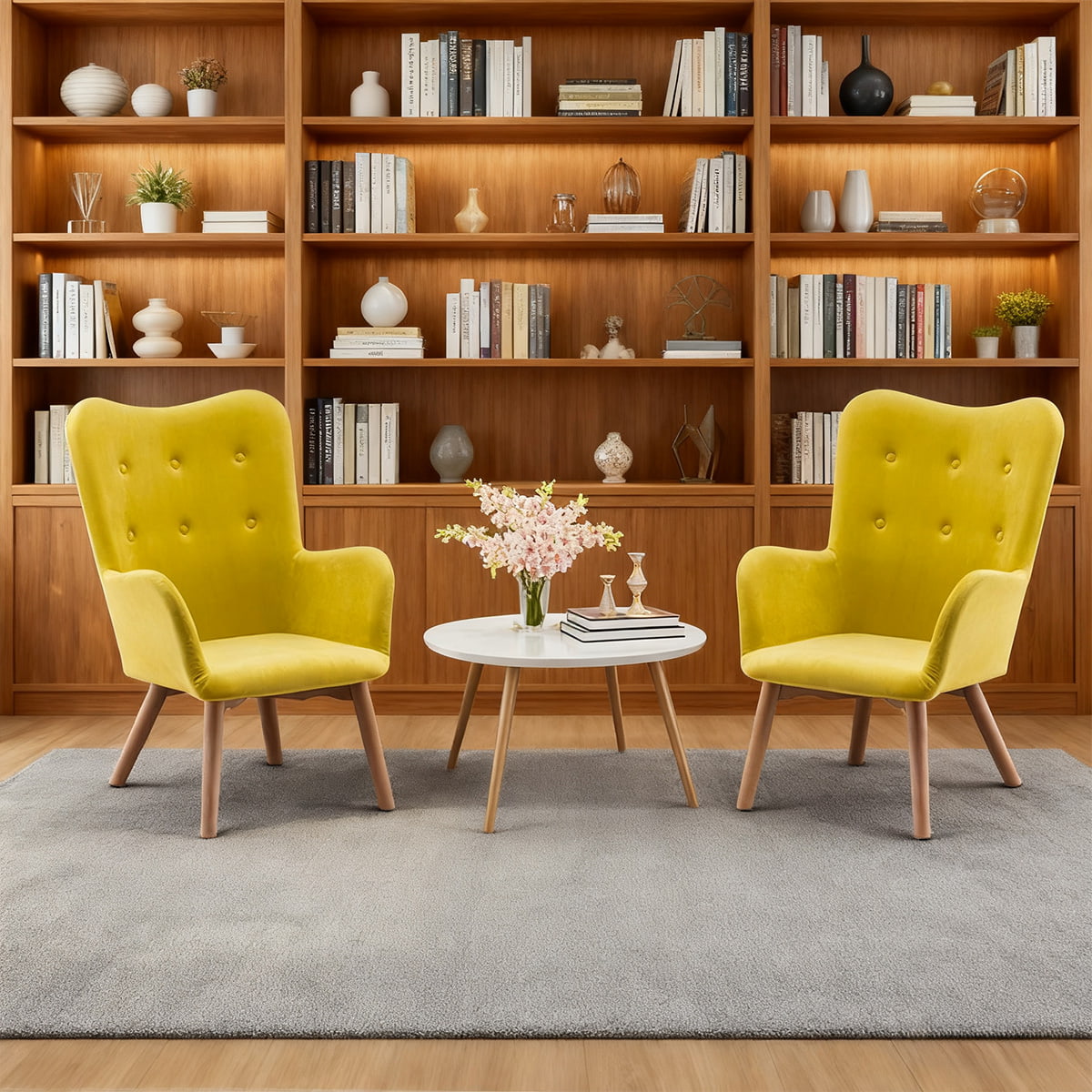 Fotoliu modern din catifea galbenă — Scaun pentru petrecere a timpului liber cu smocuri cu aripi cu picioare și cotiere din lemn pentru sufragerie, dormitor sau birou