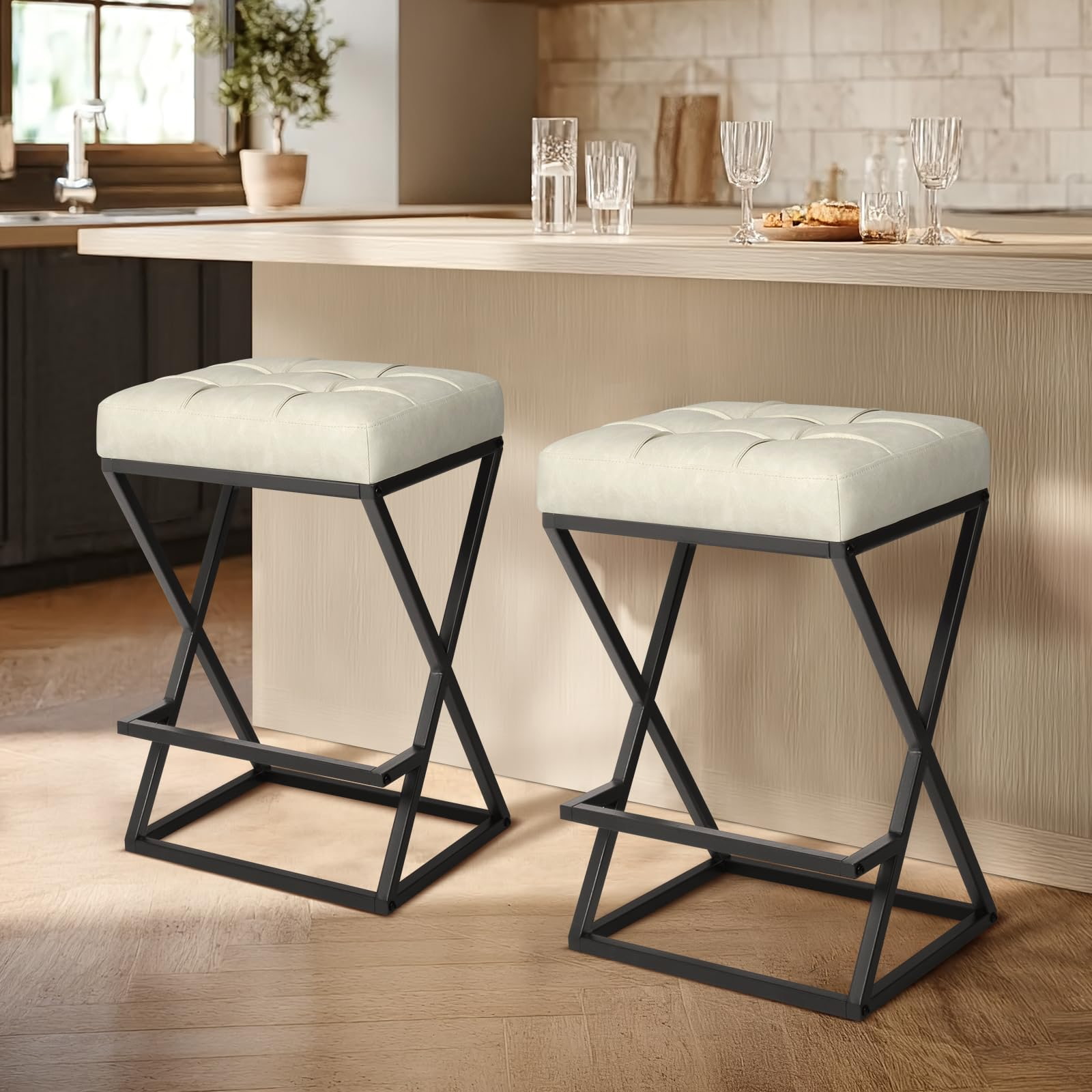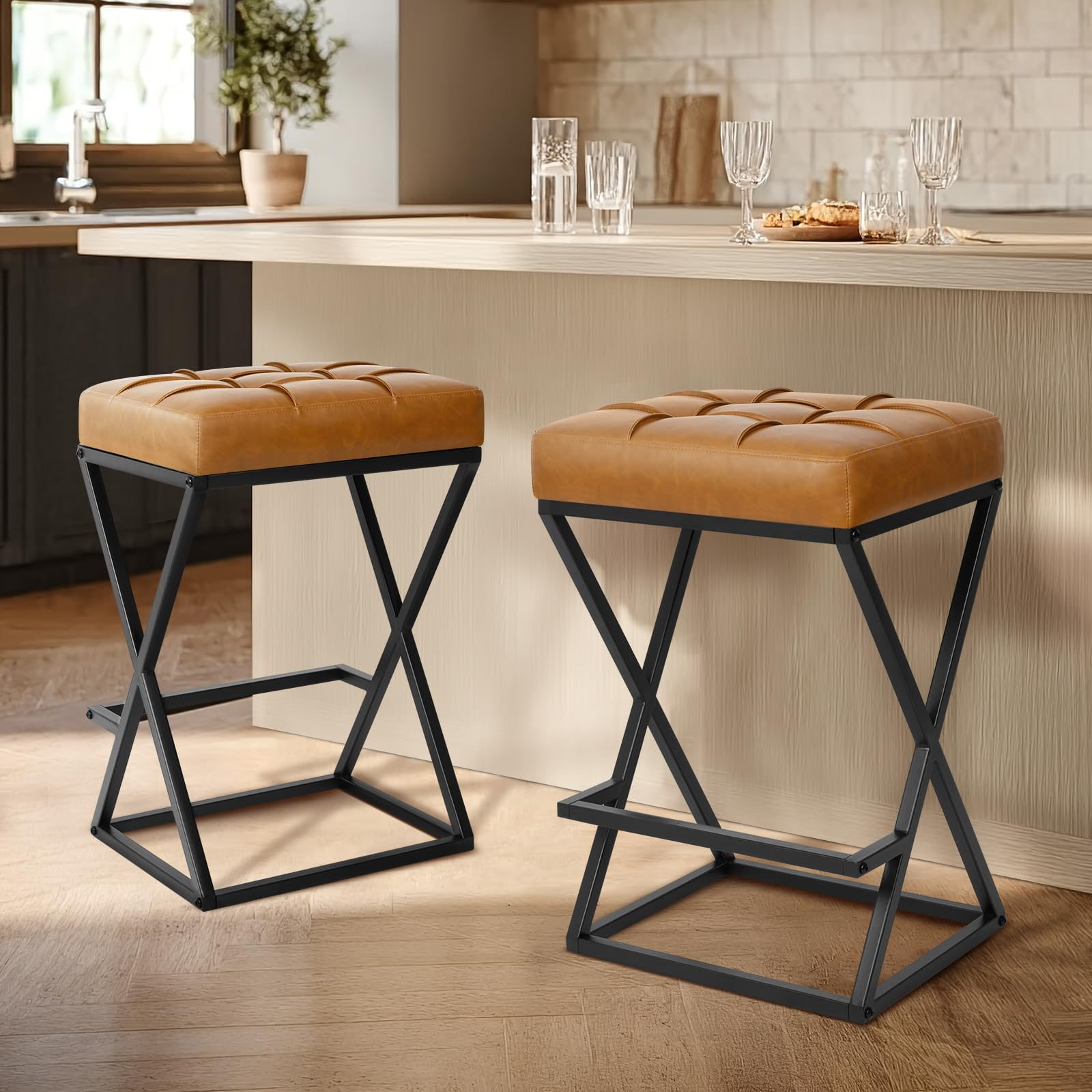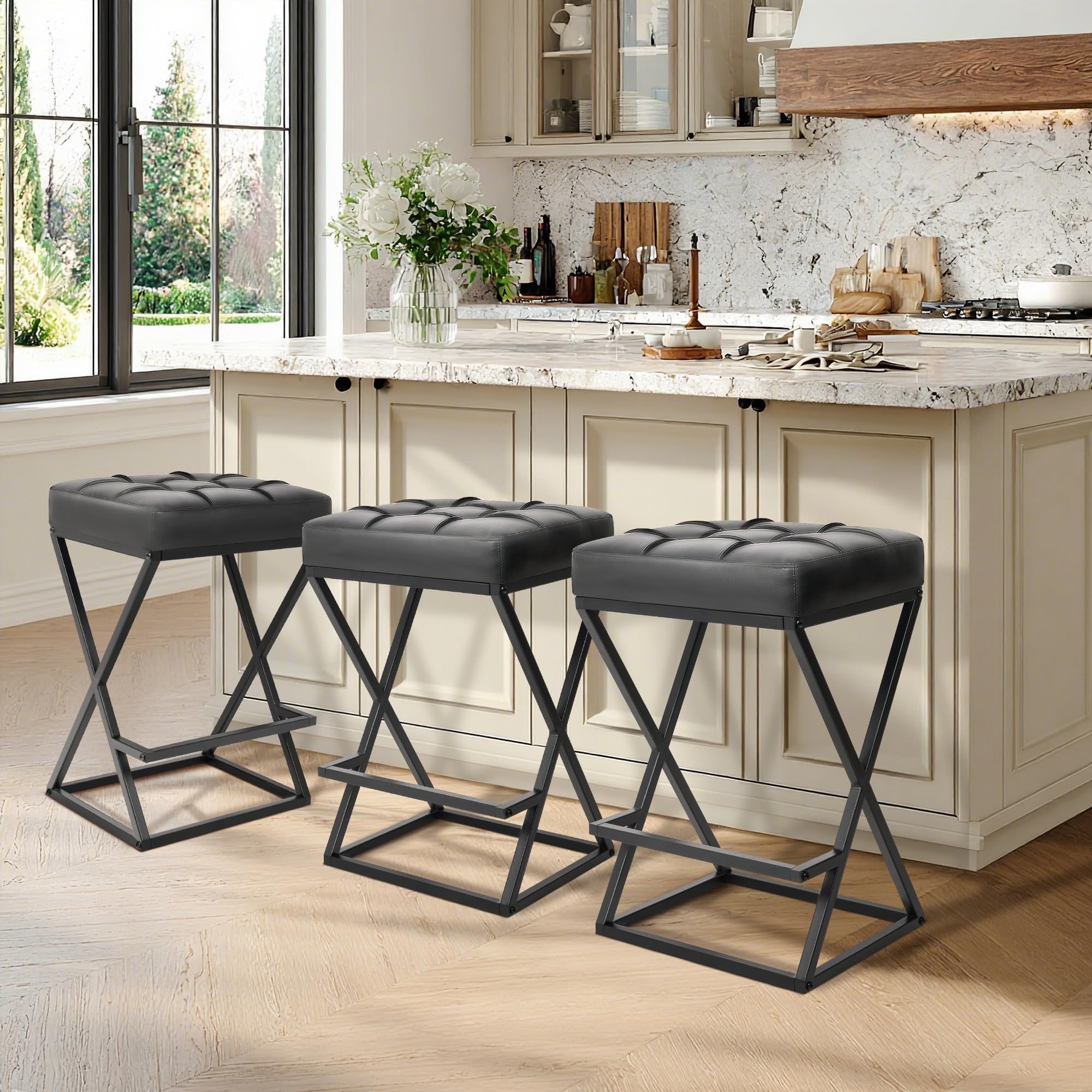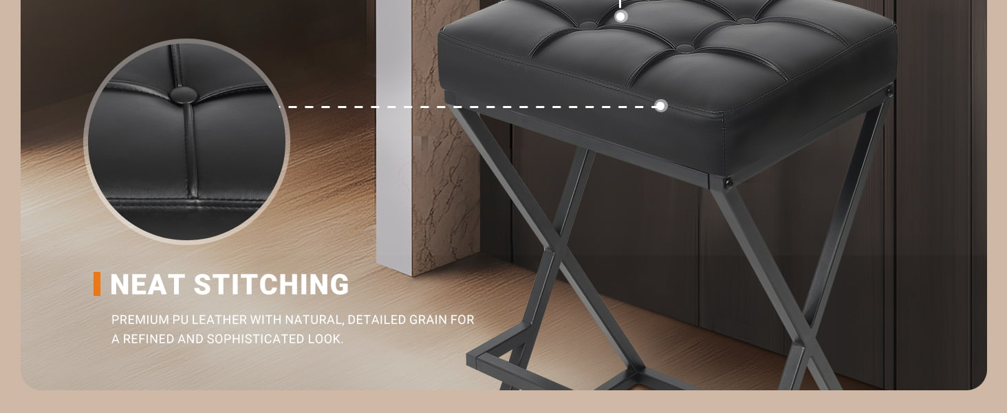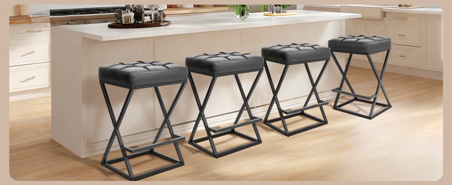 Scaune de bar fără spătar cu înălțime de blat cu scaun tapițat din piele, stabilitate metalică cu cadru în X cu suport pentru picioare pentru insulele de bucătărie negru