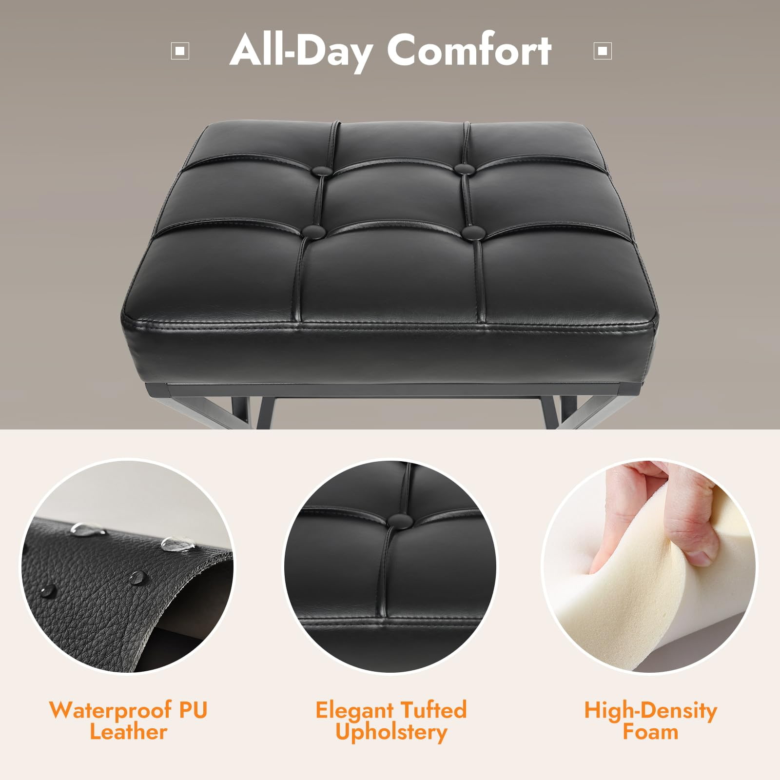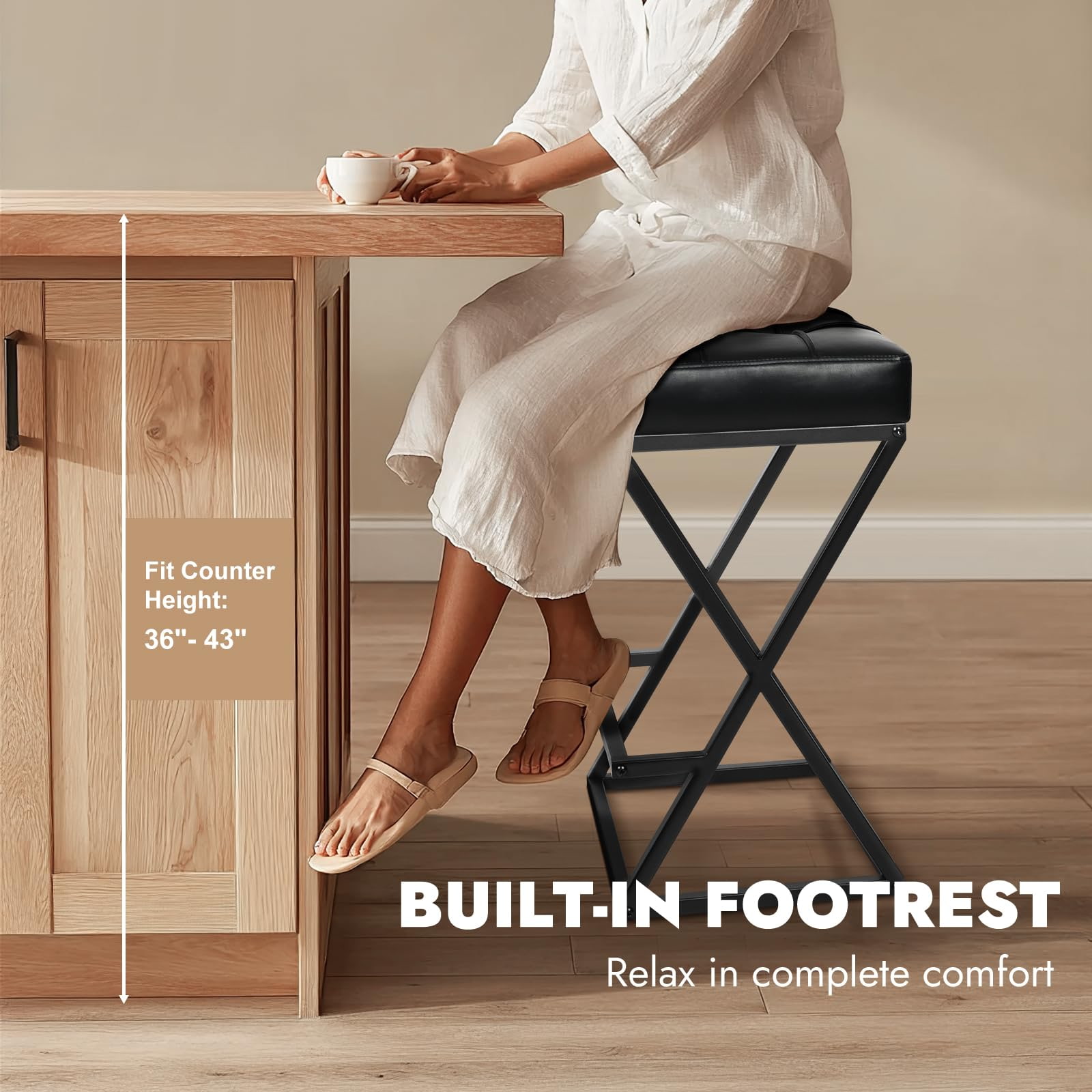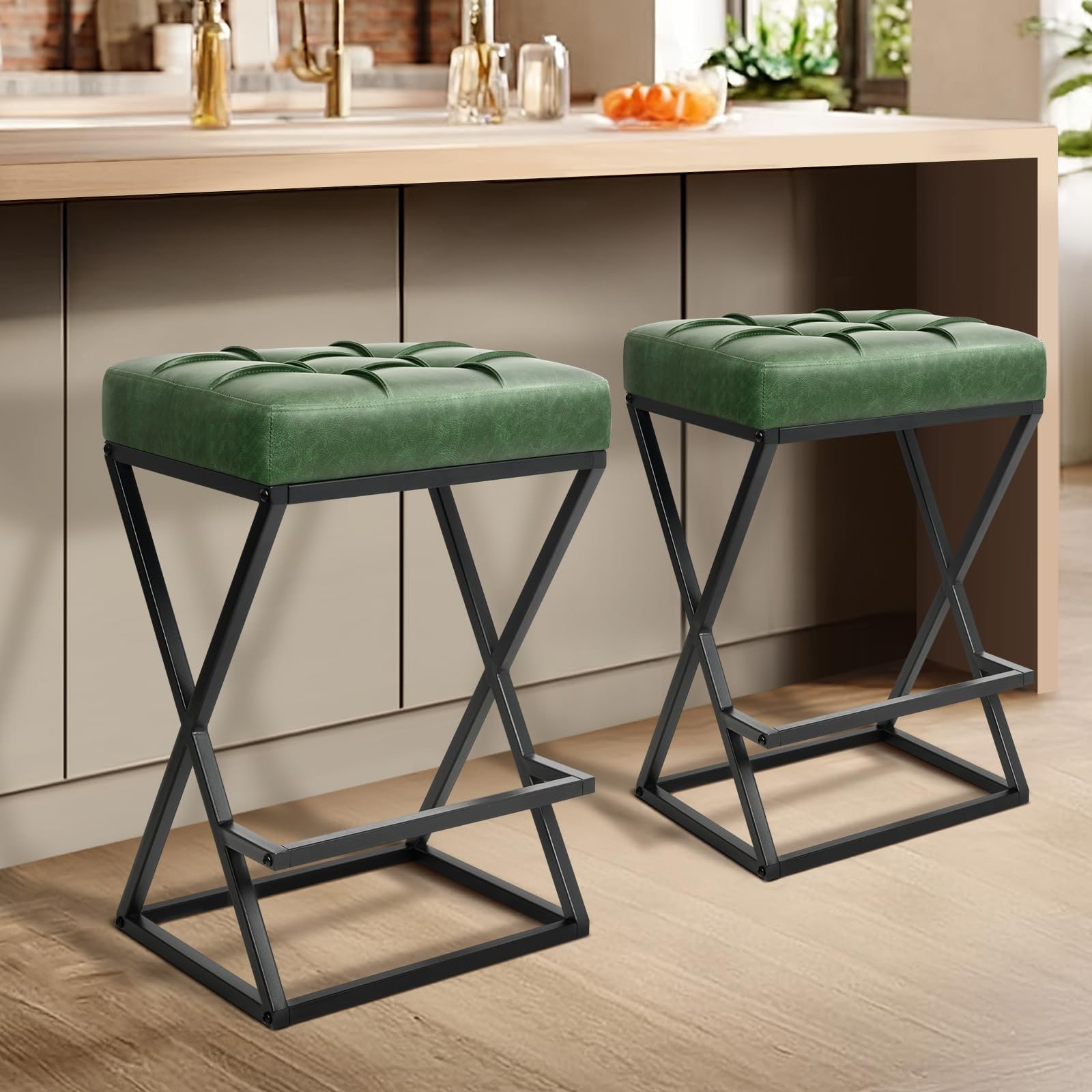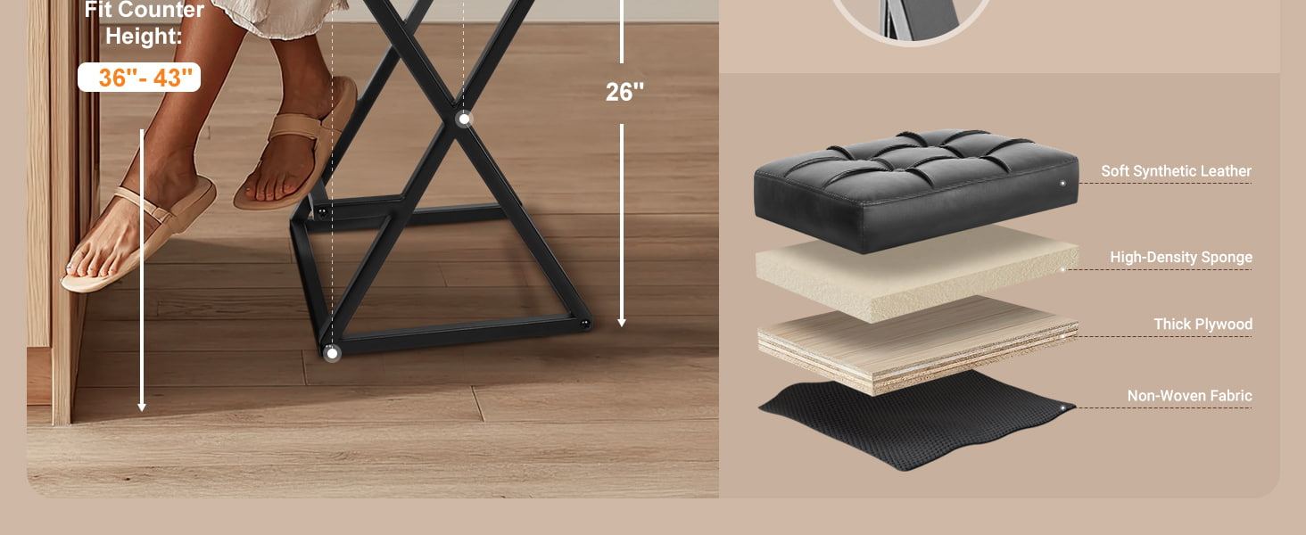 Scaune de bar fără spătar cu înălțime de blat cu scaun tapițat din piele, stabilitate metalică cu cadru în X cu suport pentru picioare pentru insulele de bucătărie negru