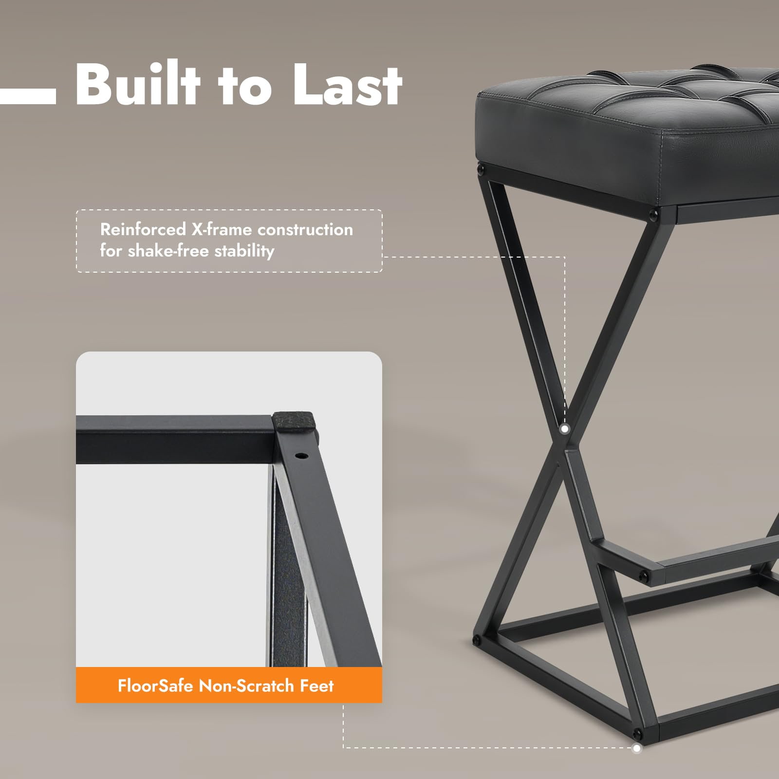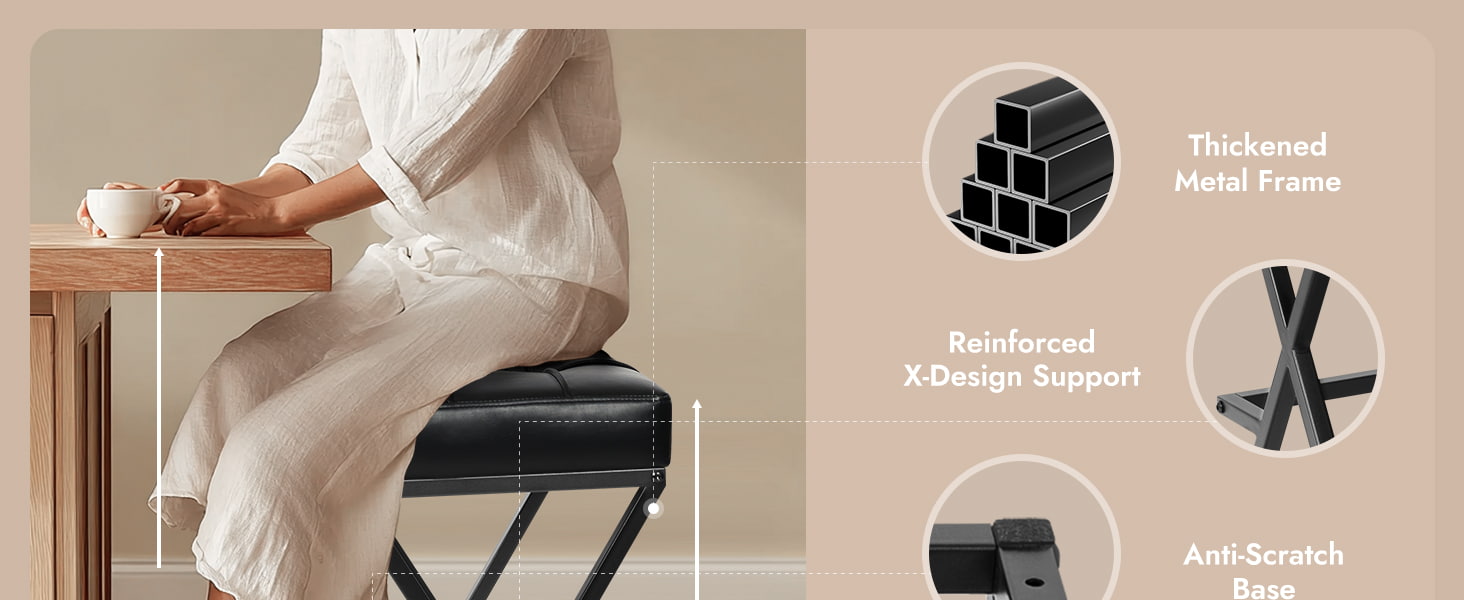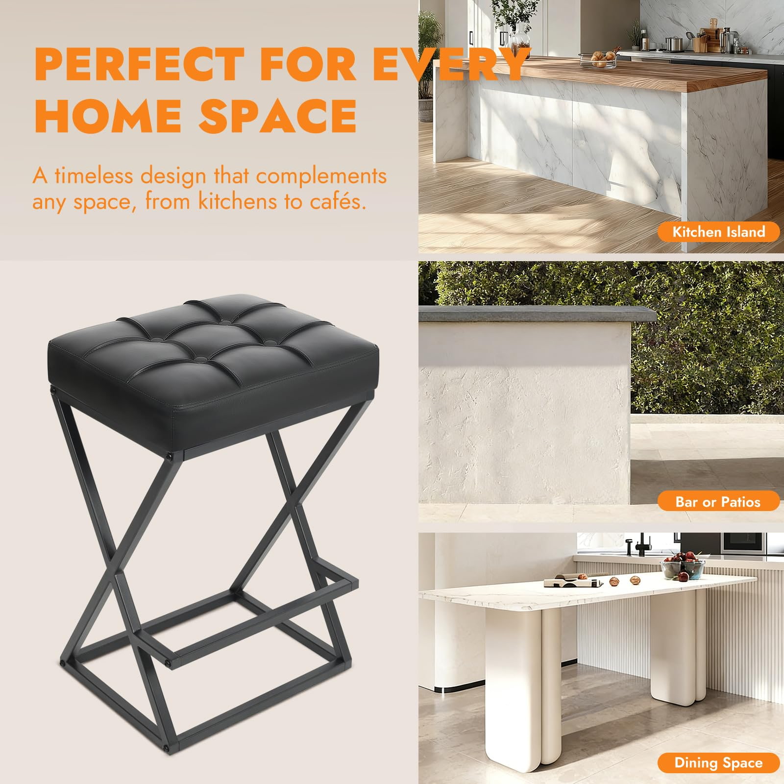Conceput atât pentru medii rezidențiale, cât și pentru medii comerciale ușoare, acest scaun de bar fără spătar are o structură metalică întărită cu cadru în X, un scaun din piele artificială căptușit cu spumă de înaltă densitate și o amprentă compactă, ideală pentru bucătării, apartamente, cafenele și proiecte de ospitalitate. Înălțimea scaunului de 26 inchi se potrivește cu insule și blaturi standard de bucătărie, în timp ce designul fără spătar permite scaunului să alunece complet pe dedesubt, maximizând spațiul util.