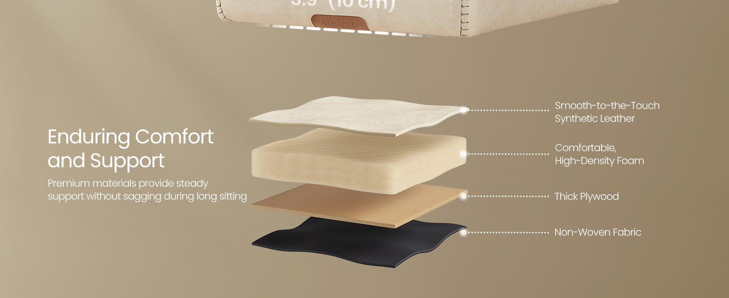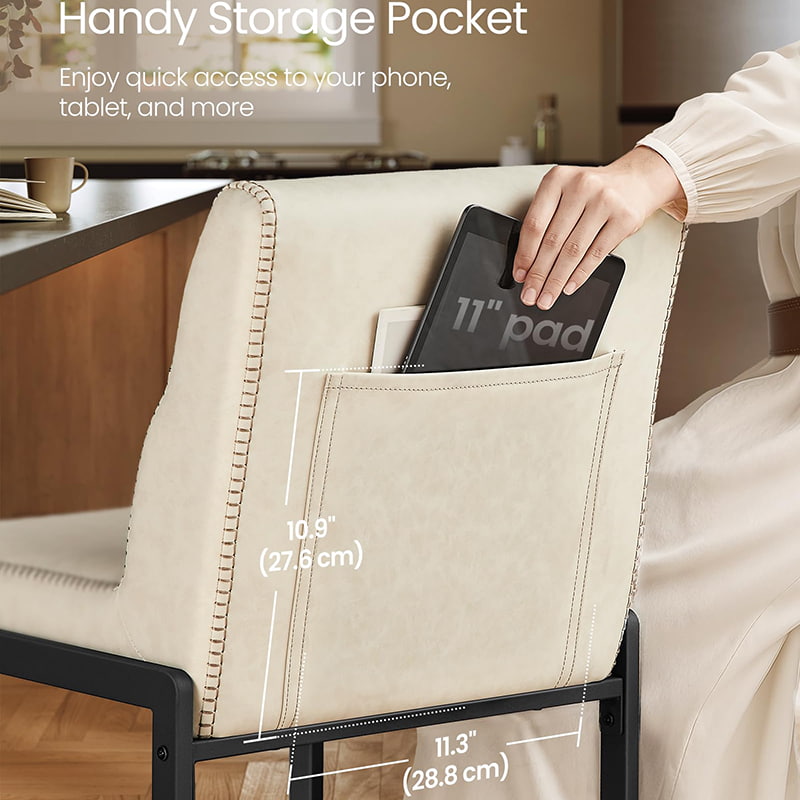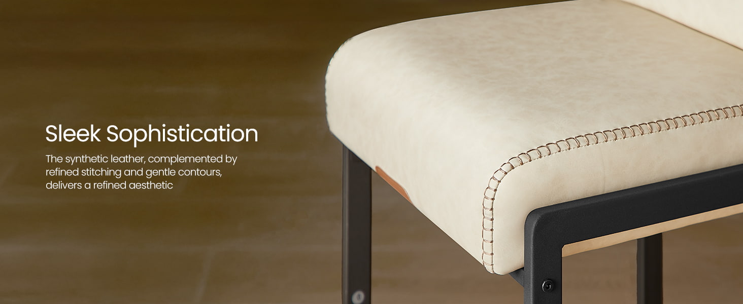 Suprafața netedă din piele sintetică este detaliată cu cusături subtile, oferind un aspect lucrat, rămânând în același timp ușor de întreținut — ideală pentru gospodăriile ocupate și pentru medii comerciale ușoare. Marginea scaunului ușor curbată ajută la reducerea presiunii picioarelor, în timp ce buzunarul integrat din spate adaugă spațiu de depozitare convenabil pentru telefoane, tablete sau obiecte esențiale. Sprijinit de un cadru metalic robust cu picioare reglabile ascunse, acest scaun de bar asigură stabilitate pe diferite suprafețe de podea și se adaptează fără efort bucătăriilor moderne, spațiilor de luat masa sau zonelor de divertisment casual.
