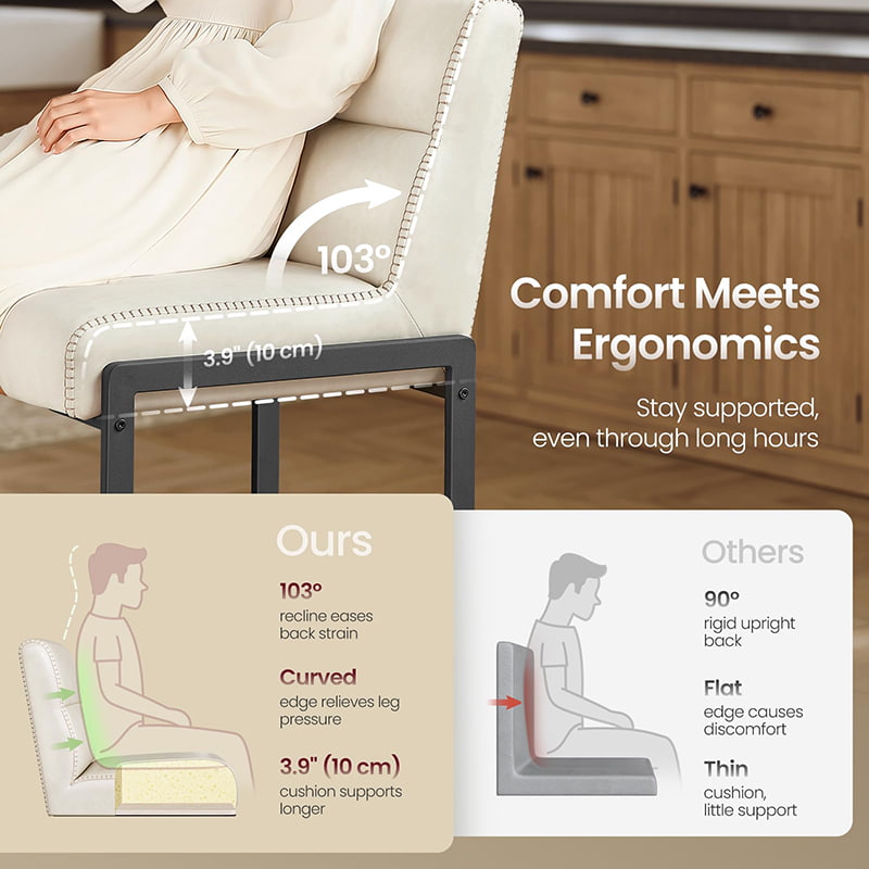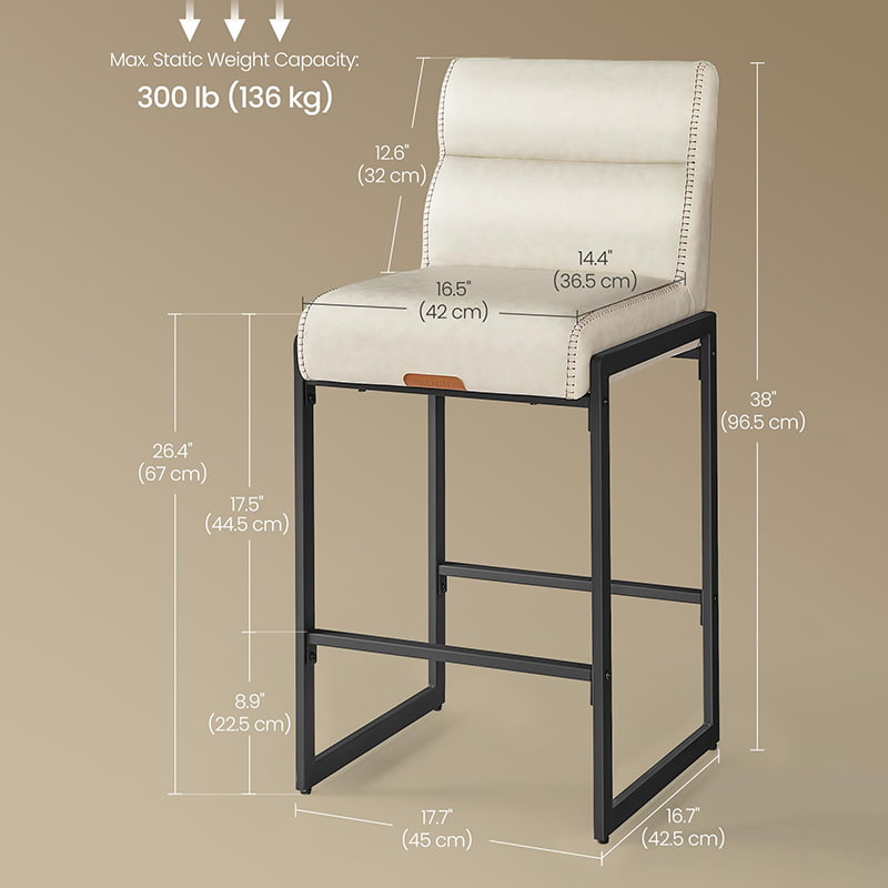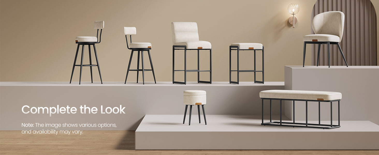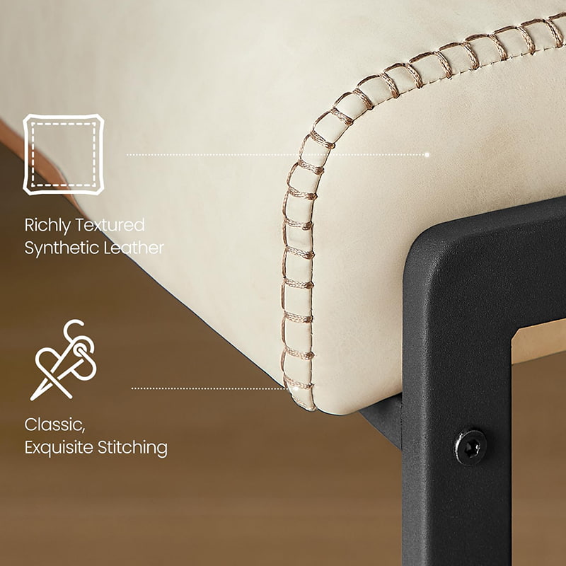 Scaune de bar moderne de la mijlocul secolului concepute pentru blaturile de bucătărie și insule de luat masa, aceste scaune alb crem cu înălțime de blat au tapițerie durabilă din piele sintetică, cu cusături rafinate și un cadru metalic arhitectural curat. Spătarul ergonomic segmentat de 103 de grade, scaunul cu perne de 3,9 inchi grosime și marginea frontală curbată oferă confort de durată pentru o ședere lungă, făcându-le potrivite atât pentru bucătăriile rezidențiale, cât și pentru mediile comerciale ușoare, cum ar fi cafenelele sau showroom-urile.